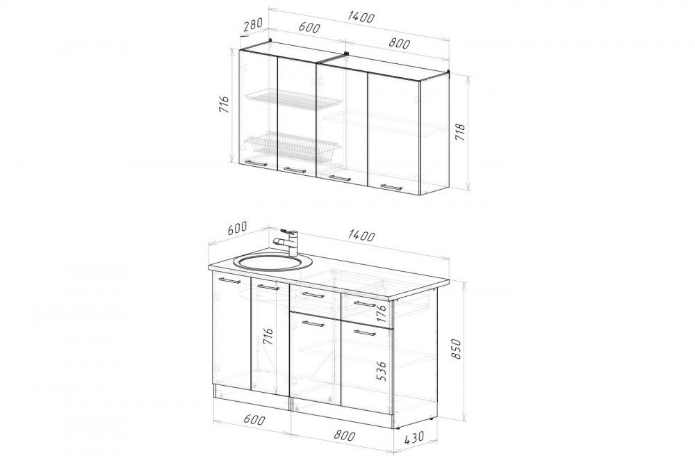 Ширина: 1400 мм; Глубина: 600 мм (со столешницей)